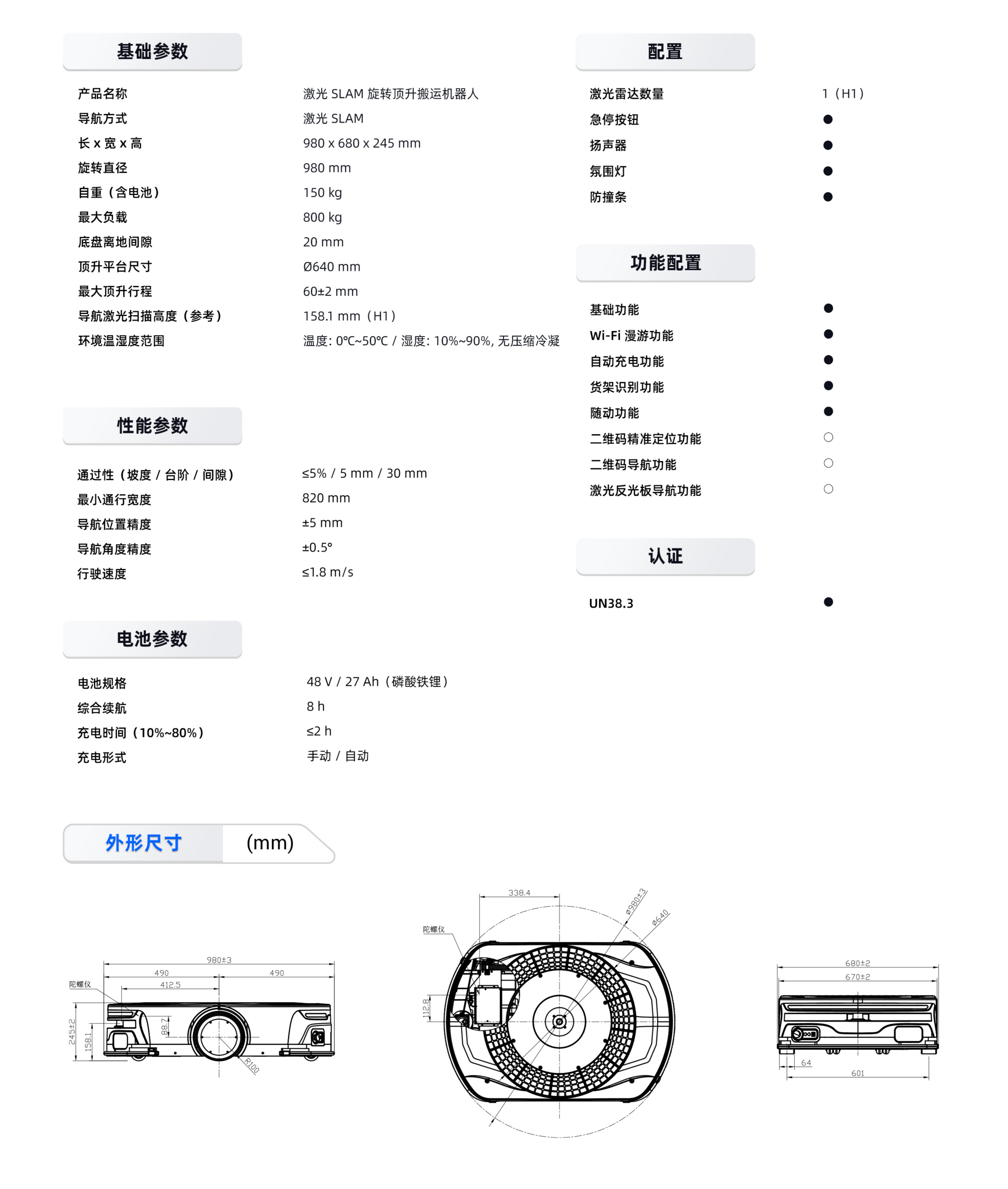 整机高度仅 245 mm,适应更多货架搬运场景。 可控制机器人本体的转向与顶升货物的转向,轻松搞定窄通道、料架密集区等场景。
